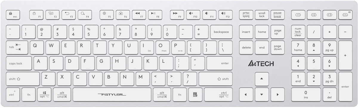 Модель: Fstyler FBX50C. Тип соединения клавиатуры: беспроводной. Бренд: A4TECH. PartNumber/Артикул Производителя: FBX50C WHITE. Клавиатура с русскими буквами: ДА. Интерфейс: USB. Основной цвет: белый. Тип беспроводного соединения клавиатуры: Bluetooth/Радиоканал. Мультимедийные дополнительные клавиши: ДА. Клавиатура Slim-дизайна: ДА. Перезаряжаемая (с базой для подзарядки): ДА. Размеры клавиатуры: 420x20x126мм. Цвет: белый. Материал корпуса: пластик/металл. Количество клавиш: 109. Ссылка на сайт поставщика/вендора: http://ru.a4tech.com/product.aspx?id=268#2. Длина упаковки (ед): 0.48. Ширина упаковки (ед): 0.19. Высота упаковки (ед): 0.031. Габариты упаковки (ед) ДхШхВ: 0.48x0.19x0.031. Вес упаковки (ед): 0.85. Объем упаковки (ед): 0.0028272. Тип: Клавиатура. Клавиши островного типа: ДА. Дизайн клавиш: квадратные. Радиус действия клавиатуры: 10. Тип элементов питания: собственный Li-ion аккумулятор. Цвет английских букв: серый. Цвет русских букв: серый. Цвет клавиш: белый. Цвет корпуса клавиатуры: белый. Ширина клавиатуры: 420. Высота клавиатуры: 20. Глубина клавиатуры: 126. Цифровой блок: ДА. EANCode: 4711421972772.