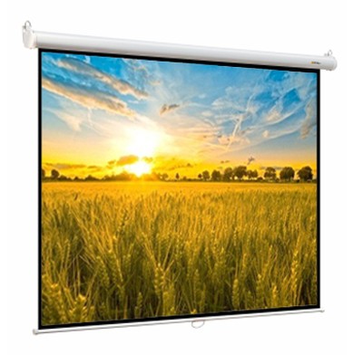 : Особенности: Ручной привод. Корпус экрана полукруглого сечения выполнен из стали с белым полимерным покрытием и ударопрочного пластика. Нижняя натяжная стальная планка круглого сечения диаметром 20 мм с белым полимерным покрытием.: