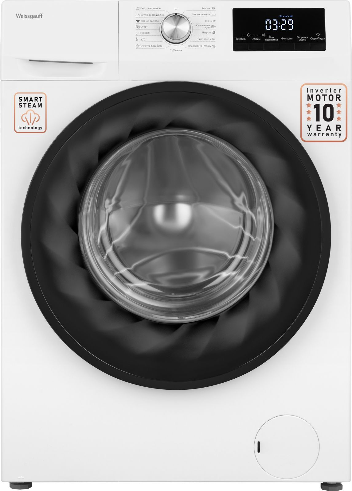 Модель: WM 61410 Inverter Steam. Направление открывания люка: влево. Уровень шума при стирке: 56. Уровень шума при отжиме: 72. Потребляемая мощность: 1750. Расход воды: 66. Количество программ: 15. Блокировка от случайного нажатия: ДА. Цвет люка: черный. Максимальное время отсрочки старта: 24. Регулируемые ножки: ДА. Вес: 67. Бренд: WEISSGAUFF. PartNumber/Артикул Производителя: 430934. Глубина: 61. Тип загрузки: фронтальная. Максимальная загрузка: 10. Максимальная скорость отжима: 1400. Диаметр загрузочного люка: 52. Тип управления: электронное. Класс энергопотребления: A+++. Защита от протечек: ДА. Быстрая стирка: ДА. Предварительная стирка: ДА. Дополнительное полоскание: ДА. Программа для детской одежды: ДА. Отсрочка старта: ДА. Защита от детей: ДА. Цвет: белый. Дисплей: ДА. Длина кабеля: 1.5. Обработка паром: ДА. Размеры: 59.5x84.5x61см. Напряжение питания: 220-240 В. Размерность по глубине: полноразмерная 50-60см. Длина упаковки (ед): 0.67. Ширина упаковки (ед): 0.64. Высота упаковки (ед): 0.87. Габариты упаковки (ед) ДхШхВ: 0.67x0.64x0.87. Вес упаковки (ед): 70. Объем упаковки (ед): 0.373056. Инверторный мотор: ДА. Тип: Стиральная машина. Звуковой сигнал окончания стирки: ДА. Возможность поставить сверху сушку: ДА. Дозагрузка белья: ДА. Программа 'Пуховые изделия': ДА. Программа 'Спорт': ДА. Хлопок: ДА. Шерсть: ДА. Экономичная стирка ECO: ДА. Размерность по глубине (для фильтра Ситилинк): полноразмерная. Ширина: 59.5. Высота: 84.5. EANCode: 4393720472414.