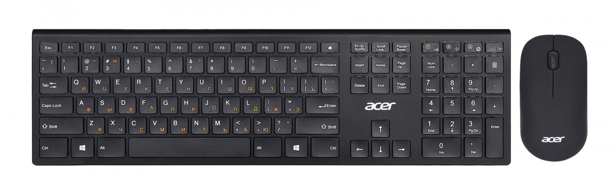 Модель: OKR030. Интерфейс подключения: USB. Тип соединения клавиатуры: беспроводной. Клавиатура Slim-дизайна: ДА. Питание клавиатуры: 2хААА. Основной цвет клавиатуры: черный. Тип мыши: оптическая. Разрешение сенсора максимальное: 1200. Количество кнопок мыши: 3. Колесо прокрутки: ДА. Питание мыши: 2хAA. Основной цвет (мышь): черный. Бренд: ACER. PartNumber/Артикул Производителя: ZL.KBDEE.005. Цвет клавиатуры: черный. Цвет мыши: черный. Размеры клавиатуры: 436.3x124.6x25мм. Размеры мыши: 113x60x31.7мм. Тип беспроводного соединения мыши: Радио. Ссылка на сайт поставщика/вендора: https://www.acer.com/ac/ru/RU/content/model/ZL.KBDEE.005. Длина упаковки (ед): 0.53. Ширина упаковки (ед): 0.13. Высота упаковки (ед): 0.04. Габариты упаковки (ед) ДхШхВ: 0.53x0.13x0.04. Вес упаковки (ед): 0.715. Объем упаковки (ед): 0.002756. Тип товара: Клавиатура + мышь. Радиус действия: 10. Клавиши островного типа: ДА. Дизайн клавиш: квадратные. Цифровой блок: ДА. Цвет английских букв: белый. Цвет русских букв: оранжевый. Дизайн мыши: для правой и левой руки. Цвет клавиш клавиатуры: черный. Длина мыши: 113. Ширина мыши: 60. Высота мыши: 31.7. Ширина клавиатуры: 124.6. Длина клавиатуры: 436.3. Толщина клавиатуры: 25. Цвет для названия: черный. EANCode: 4710180905366.