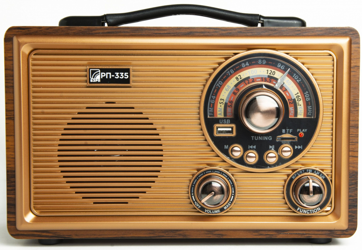 Модель: БЗРП РП-335. Тип (для названия): Радиоприемник. Мощность динамика (Вт): 5. Количество динамиков: 2. Ручка для переноски: ДА. Разъем USB: 1. Разъем для карт памяти: microSD. Цвет (для фильтра): коричневый. Бренд: СИГНАЛ. PartNumber/Артикул Производителя: 11514. Глубина: 145. Тип: портативный. Тип тюнера: аналоговый. MW-диапазон: ДА. SW-диапазон: ДА. Тип антены: телескопическая. Тип батарей питания: аккумулятор. Время автономной работы: 4. Возможность питания от сети: ДА. Цвет: дерево коричневое. Размеры: 280x185x145мм. УКВ-диапазон: ДА. Ссылка на сайт поставщика/вендора: https://signalelectronics.ru/katalog/multimedia/radiopriemniki/bzrp-rp-335. Длина упаковки (ед): 0.31. Ширина упаковки (ед): 0.17. Высота упаковки (ед): 0.21. Габариты упаковки (ед) ДхШхВ: 0.31x0.17x0.21. Вес упаковки (ед): 2.021. Объем упаковки (ед): 0.011067. Вес: 1500. Ширина: 280. Высота: 185. EANCode: 4610151322898.