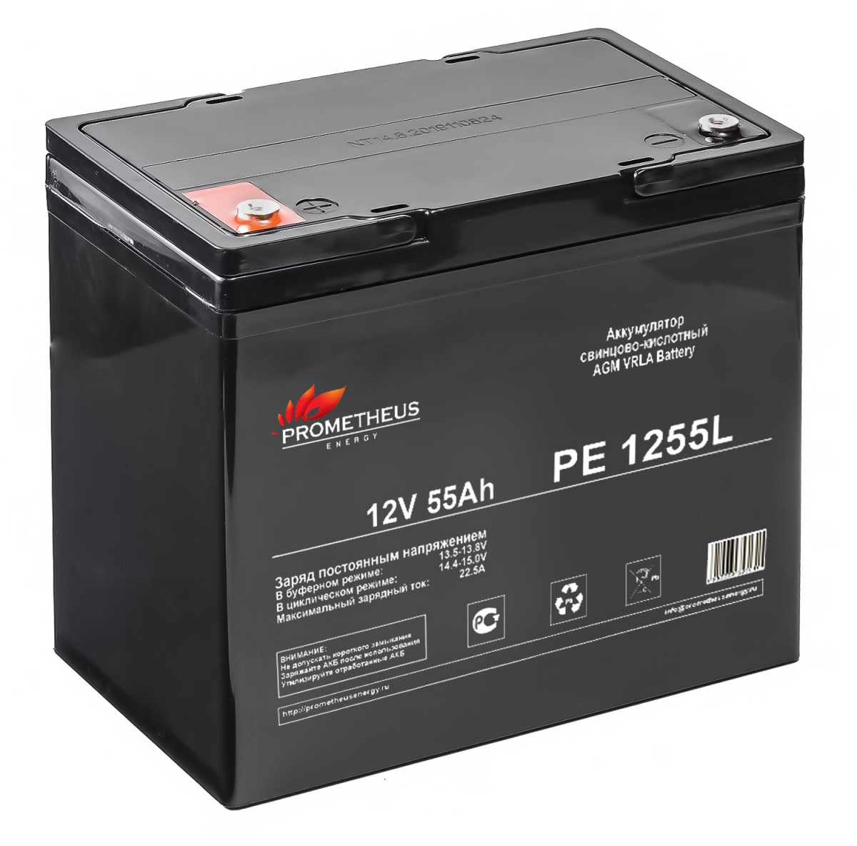: Особенности: Корпус аккумулятора изготовлен из негорючего ABS пластика. Емкость аккумуляторной батареи для ИБП составляет 55 Ah, а рабочее напряжение 12 V. Устройство обладает низким саморазрядом (до 3%). Срок службы достигает 10 лет.: Описание: Prometheus Energy свинцово-кислотный аккумулятор PE 1255L создан по технологии AGM, с абсорбированным электролитом и увеличенным сроком службы. Предлагаемый аккумулятор является не обслуживаемым. Он герметизирован, а образующийся газ рекомбинируется. Долив жидкости не требуется.: