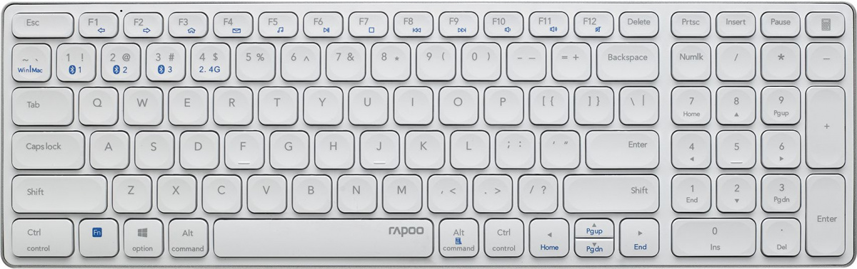 Модель: E9700M. Тип соединения клавиатуры: беспроводной. Бренд: RAPOO. PartNumber/Артикул Производителя: 14516. Клавиатура с русскими буквами: ДА. Интерфейс: USB. Основной цвет: белый. Тип беспроводного соединения клавиатуры: Bluetooth/Радиоканал. Мультимедийные дополнительные клавиши: ДА. Клавиатура Slim-дизайна: ДА. Для ноутбуков: ДА. Размеры клавиатуры: 362x13x115мм. Цвет: белый. Материал корпуса: алюминий/пластик. Вес (клавиатуры): 0.445. Ссылка на сайт поставщика/вендора: https://www.rapoo-eu.com/product/e9700m/#features-anchor. Длина упаковки (ед): 0.42. Ширина упаковки (ед): 0.125. Высота упаковки (ед): 0.03. Габариты упаковки (ед) ДхШхВ: 0.42x0.125x0.03. Вес упаковки (ед): 0.375. Объем упаковки (ед): 0.001575. Тип: Клавиатура. Клавиши островного типа: ДА. Дизайн клавиш: квадратные. Радиус действия клавиатуры: 10. Тип элементов питания: собственный Li-ion аккумулятор. Цвет английских букв: белый. Цвет русских букв: белый. Цвет клавиш: белый. Цвет корпуса клавиатуры: белый. Ширина клавиатуры: 362. Высота клавиатуры: 13. Глубина клавиатуры: 115. Цифровой блок: ДА. EANCode: 6940056145161.