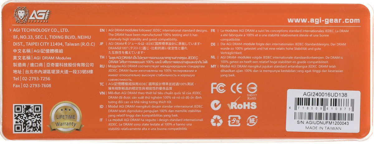 Модель: AGI240016UD138. Количество контактов: 288-pin. Показатель скорости: PC4-19200. Скорость (тест): 2400МГц. Напряжение (тест): 1.2В. Бренд: AGI. PartNumber/Артикул Производителя: AGI240016UD138. Длина упаковки (ед): 0.17. Ширина упаковки (ед): 0.07. Высота упаковки (ед): 0.01. Габариты упаковки (ед) ДхШхВ: 0.17x0.07x0.01. Вес упаковки (ед): 0.03. Объем упаковки (ед): 0.000119. Тип: Оперативная память. Суммарный объем памяти всего комплекта: 16. Объем одного модуля: 16. Пропускная способность: 19200. Серия: UD138. Тип памяти: DDR4. Объем: 16384. Частотная спецификация: 2400. Количество в упаковке: 1. Тип поставки: Ret. Форм-фактор: DIMM. Буферизация: unbuffered. EANCode: 4718009610873.