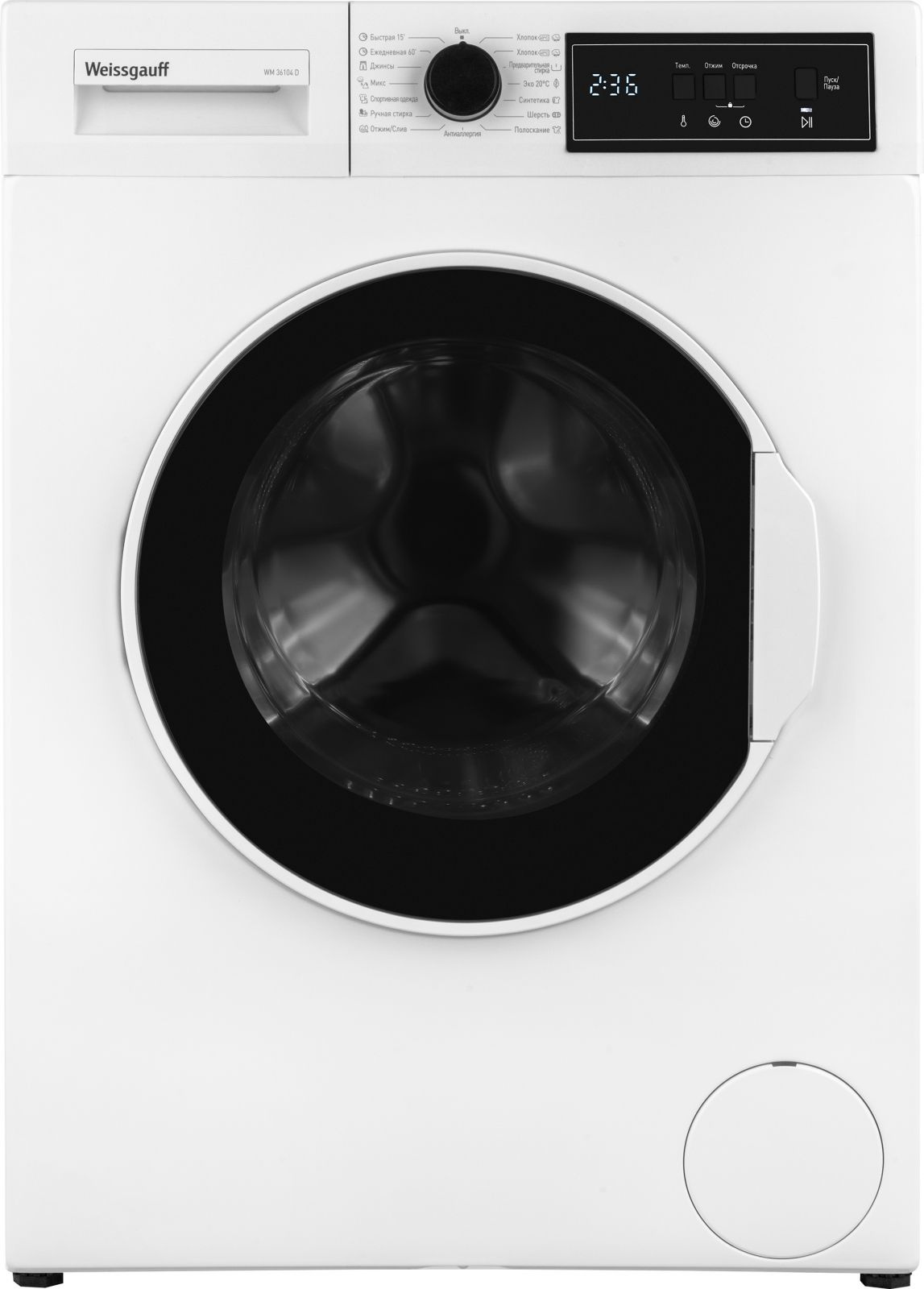 Модель: WM 36104 D. Направление открывания люка: влево. Уровень шума при стирке: 58. Потребляемая мощность: 1850. Расход воды: 38. Количество программ: 15. Блокировка от случайного нажатия: ДА. Цвет люка: черный. Максимальное время отсрочки старта: 23. Регулируемые ножки: ДА. Бренд: WEISSGAUFF. PartNumber/Артикул Производителя: 430657. Глубина: 36.2. Тип загрузки: фронтальная. Максимальная загрузка: 4. Максимальная скорость отжима: 1000. Тип управления: электронное. Класс энергопотребления: A+. Быстрая стирка: ДА. Предварительная стирка: Да. Дополнительное полоскание: ДА. Отсрочка старта: ДА. Защита от детей: ДА. Цвет: белый. Дисплей: ДА. Размеры: 59.7x84.5x36.2см. Напряжение питания: 220-240 В. Размерность по глубине: узкая 30-35см. Ссылка на сайт поставщика/вендора: https://www.weissgauff.ru/goods_166411/ctiral_naya_mashina_weissgauff_wm_36104_d.html. Длина упаковки (ед): 0.641. Ширина упаковки (ед): 0.416. Высота упаковки (ед): 0.85. Габариты упаковки (ед) ДхШхВ: 0.641x0.416x0.85. Вес упаковки (ед): 49. Объем упаковки (ед): 0.2266576. Тип: Стиральная машина. Продолжительность быстрой стирки: 15. Программа 'Джинсы': ДА. Программа 'Спорт': ДА. Ручная стирка: ДА. Синтетика: ДА. Хлопок: ДА. Шерсть: ДА. Размерность по глубине (для фильтра Ситилинк): узкая. Ширина: 59.7. Высота: 84.5. EANCode: 4393720471080.