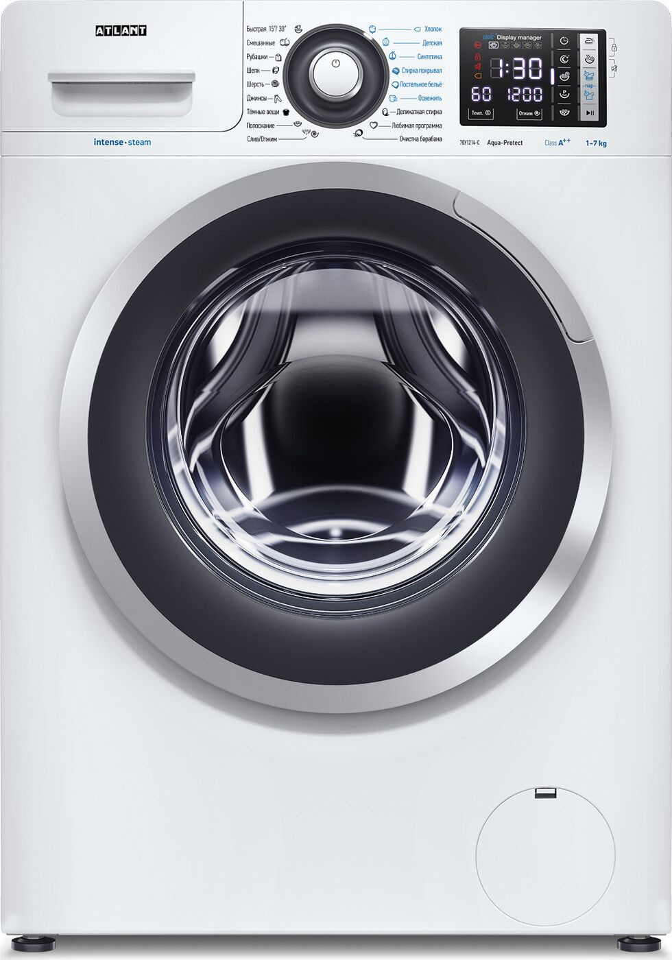 Модель: СМА 70У1214-С-01. Направление открывания люка: влево. Материал барабана: нержавеющая сталь. Уровень шума при стирке: 59. Уровень шума при отжиме: 75. Потребляемая мощность: 1900. Расход воды: 52.5. Количество программ: 18. Блокировка от случайного нажатия: ДА. Цвет люка: черный. Максимальное время отсрочки старта: 24. Регулируемые ножки: ДА. Вес товара: 63. Бренд: АТЛАНТ. PartNumber/Артикул Производителя: СМА 70У1214-С-01. Глубина товара: 40.6. Тип загрузки: фронтальная. Максимальная загрузка: 7. Максимальная скорость отжима: 1200. Диаметр загрузочного люка: 34. Тип управления: электронное. Класс стирки: A. Класс отжима: B. Класс энергопотребления: A++. Быстрая стирка: ДА. Деликатная стирка: ДА. Программа для детской одежды: ДА. Отсрочка старта: ДА. Защита от детей: ДА. Цвет: белый. Дисплей: ДА. Обработка паром: ДА. Размеры: 59.6x84.6x40.6см. Напряжение питания: 220-240 В. Защита от скачков напряжения: ДА. Размерность по глубине: средняя 40-45см. Длина упаковки (ед): 0.63. Ширина упаковки (ед): 0.54. Высота упаковки (ед): 0.86. Габариты упаковки (ед) ДхШхВ: 0.63x0.54x0.86. Вес упаковки (ед): 62. Объем упаковки (ед): 0.292572. Тип: Стиральная машина. Глубина с учетом выступающих элементов: 48.9. Звуковой сигнал окончания стирки: ДА. Программа 'Джинсы': ДА. Синтетика: ДА. Хлопок: ДА. Шерсть: ДА. Шелк: ДА. Размерность по глубине (для фильтра Ситилинк): средняя. Ширина товара: 59.6. Высота товара: 84.6. EANCode: 4811159062575.