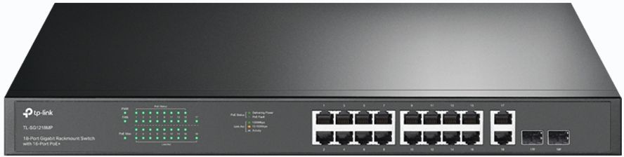 Модель: TL-SG1218MP. Бренд: TP-LINK. PartNumber/Артикул Производителя: TL-SG1218MP. Глубина: 180. Количество портов RJ-45: 18. Размеры: 440x44x180мм. Исполнение: внутреннее. Материал корпуса: металл. Уровень коммутатора: L2. Ссылка на сайт поставщика/вендора: https://www.tp-link.com/ru/business-networking/poe-switch/tl-sg1218mp/. Длина упаковки (ед): 0.526. Ширина упаковки (ед): 0.25. Высота упаковки (ед): 0.08. Габариты упаковки (ед) ДхШхВ: 0.526x0.25x0.08. Вес упаковки (ед): 3.083. Объем упаковки (ед): 0.01052. Базовая скорость передачи данных: 1 Гбит/с. Внутренняя пропускная способность: 36 Гбит/сек. Наличие PoE портов: ДА. Тип: неуправляемый. Установка: монтируемый в 19' стойку. Семейство: JetStream. Порты 10/100/1000BASE-T: 18. Комбо-порты 10/100/1000BASE-T/Mini GBIC (SFP): 2. Таблица MAC-адресов: 8. Ширина: 440. Высота: 44. Кол-во портов с поддержкой PoE+: 16. PoE бюджет: 250. EANCode: 6935364072155.