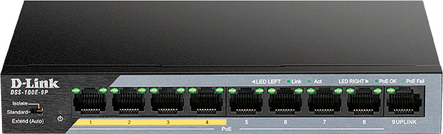 Модель: DSS-100E-9P/B1A. Вес товара: 0.41. Бренд: D-LINK. PartNumber/Артикул Производителя: DSS-100E-9P/B1A. Глубина товара: 104. Количество портов RJ-45: 9. Кол-во портов с поддержкой PoE: 8. Размеры: 177x26x104мм. Температура эксплуатации: от 0 до +40. Исполнение: внутреннее. Материал корпуса: металл. Уровень коммутатора: L2. Ссылка на сайт поставщика/вендора: https://www.dlink.ru/ru/products/1/2682.html. Длина упаковки (ед): 0.24. Ширина упаковки (ед): 0.21. Высота упаковки (ед): 0.09. Габариты упаковки (ед) ДхШхВ: 0.24x0.21x0.09. Вес упаковки (ед): 1.333. Объем упаковки (ед): 0.004536. Базовая скорость передачи данных: 10/100/1000 Мб/с. Внутренняя пропускная способность: 3.6 Гбит/сек. Температура хранения: от -40 до +70. Наличие PoE портов: ДА. Пересылка пакетов: 2.6784. Буфер: 0.125. Расширение до 250м: ДА. Тип: неуправляемый. Установка: настольный. Порты 10/100BASE-TX: 8. Порты 10/100/1000BASE-T: 1. Таблица MAC-адресов: 2. Ширина товара: 177. Высота товара: 26. PoE бюджет: 92. EANCode: 790069451089.