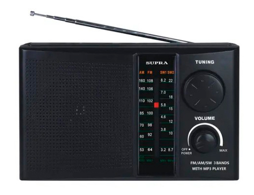 Модель: ST-19U. Тип (для названия): Радиоприемник. Мощность динамика (Вт): 4. Количество динамиков: 1. Разъем USB: 1. Воспроизведение файлов: MP3. Цвет (для фильтра): черный. Бренд: SUPRA. PartNumber/Артикул Производителя: ST-19U. Тип: портативный. Тип тюнера: аналоговый. FM-диапазон: ДА. AM-диапазон: ДА. SW-диапазон: ДА. Тип антены: телескопическая. Разъем подключения наушников: 3.5 мм. Тип батарей питания: R20. Количество батарей питания: 2. Возможность питания от сети: ДА. Цвет: черный. Ссылка на сайт поставщика/вендора: https://www.supra.ru/catalog/radiopriemniki/radiopriemnik_supra_st_19u/. Длина упаковки (ед): 0.21. Ширина упаковки (ед): 0.07. Высота упаковки (ед): 0.14. Габариты упаковки (ед) ДхШхВ: 0.21x0.07x0.14. Вес упаковки (ед): 0.76. Объем упаковки (ед): 0.002058. EANCode: 4897125300735.