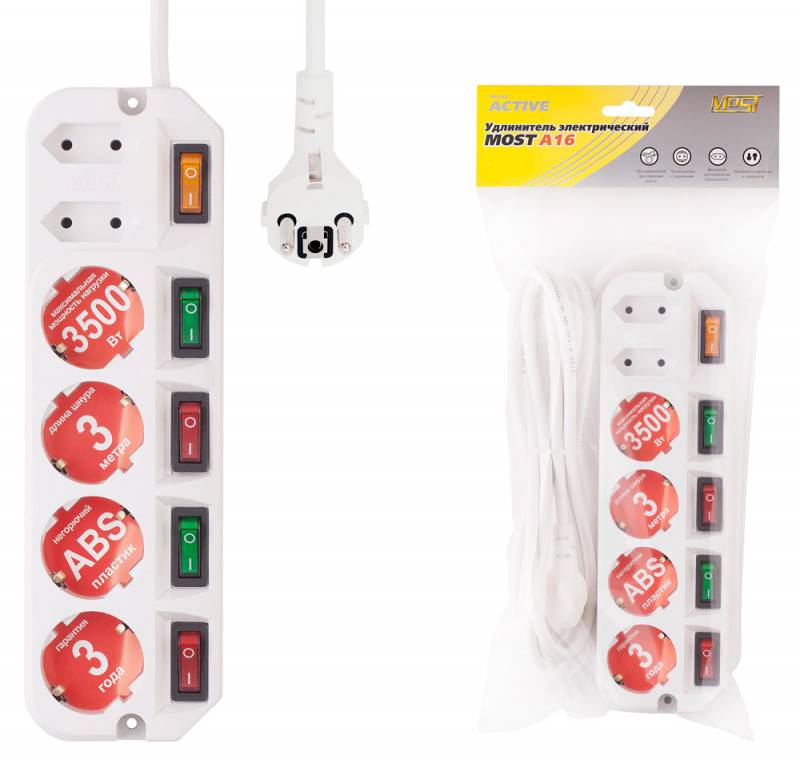 Модель: A16. Бренд: MOST. Произведено в РФ: ДА. PartNumber/Артикул Производителя: A16-Б 1.6. Количество выходных розеток: 6. Выходные розетки с заземлением типа EURO: 4. Максимальная нагрузка: 3500. Тип упаковки: пакет ПЭ. Вес упаковки (ед): 0.464. Входная вилка, тип: EURO. Длина шнура: 1.6. Индивидуальные выключатели розеток: ДА. Цвет: белый. Тип: Сетевой удлинитель. Номинальное напряжение питающей сети: 220. Выходные розетки типа EURO (плоские): 2. EANCode: 4607074521910.