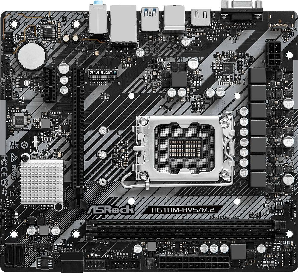 Модель: H610M-HVS/M.2 R2.0. Гнездо процессора: LGA 1700. Northbridge: Intel H610. Частотная спецификация памяти: 3200. Максимальный объем оперативной памяти: 64. Слотов PCI-E x1: 1. Звук: 8 каналов (7.1). Сетевой интерфейс: Gigabit Ethernet. Форм-фактор: mATX. Разъемов M.2: 1. Бренд: ASROCK. PartNumber/Артикул Производителя: H610M-HVS/M.2 R2.0. Тип поставки: Ret. Слотов памяти DDR4: 2. Кол-во внешних USB 2.0: 4. Разъемов SATA3: 4. Кол-во внешних USB 3.0: 2. Поддерживаемые процессоры: совместимость уточняйте на сайте производителя. Поддержка частот оперативной памяти: 3200 МГц. Поддерживаемые модули памяти: совместимость уточняйте на сайте производителя. Режим работы оперативной памяти: двухканальный. Разъем VGA: ДА. Разъем HDMI: ДА. Питание материнской платы и процессора: 24+8 pin. Сетевой контроллер: Realtek RTL8111H. Аудио контроллер: Realtek ALC897/887. Максимальное количество слотов памяти (для фильтра Ситилинк): 2. Поддержка NVMe: ДА. Слотов PCI-E 4.0 x16: 1. Ссылка на сайт поставщика/вендора: https://www.asrock.com/MB/Intel/H610M-HVSM.2%20R2.0/index.ru.asp#Specification. Поддерживаемые диски и накопители: совместимость уточняйте на сайте производителя. Длина упаковки (ед): 0.274. Ширина упаковки (ед): 0.236. Высота упаковки (ед): 0.06. Габариты упаковки (ед) ДхШхВ: 0.274x0.236x0.06. Вес упаковки (ед): 0.888. Объем упаковки (ед): 0.00387984. BIOS: AMI. Тип системы охлаждения: пассивное. Разъем питания процессора: 8 pin. Разъем питания материнской платы: 24 pin. Тип: Материнская плата. Всего слотов PCI-E: 2. Разъем M.2 Key E: ДА. Разъем SATA: SATA 3. Количество разъемов SATA: 4. 4-Pin PWM коннекторы для вентиляторов: 3. M2 2280 с интерфейсом PCI-E 3.0 х4: 1. Поддержка памяти XMP: ДА. Тип поддерживаемой памяти: DIMM. Разъем PS/2: 1 шт. (клавиатура или мышь). Разъемов D-Sub (VGA): 1. Разъемов HDMI: 1. Тип памяти: DDR4. EANCode: 4710483939914.