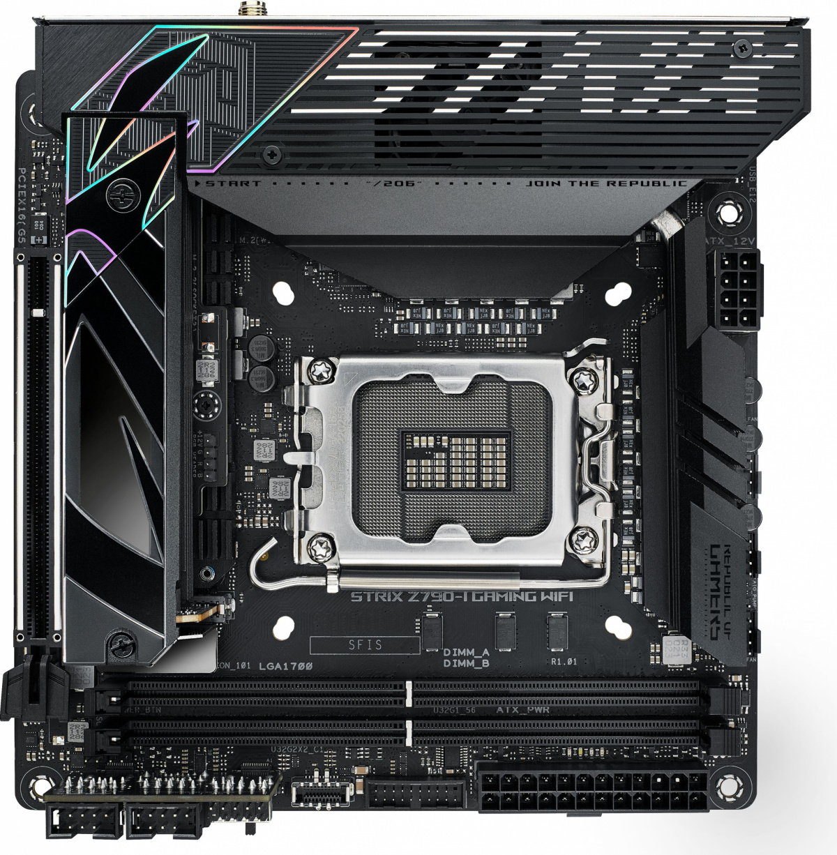 Модель: ROG STRIX Z790-I GAMING WIFI. Гнездо процессора: LGA 1700. Northbridge: Intel Z790. Частотная спецификация памяти: 5600. Максимальный объем оперативной памяти: 64. Поддержка SATA RAID: ДА. WiFi в стандартной поставке: ДА. Звук: 8 каналов (7.1). Сетевой интерфейс: 2.5Gigabit. Форм-фактор: mini-ITX. Разъемов M.2: 2. Бренд: ASUS. PartNumber/Артикул Производителя: ROG STRIX Z790-I GAMING WIFI. Тип поставки: Ret. Кол-во внешних USB 2.0: 2. Разъемов SATA3: 2. Кол-во внешних USB 3.0: 1. Поддерживаемые процессоры: совместимость уточняйте на сайте производителя. Поддерживаемые модули памяти: совместимость уточняйте на сайте производителя. Режим работы оперативной памяти: двухканальный. Поддержка RAID 0: ДА. Поддержка RAID 1: ДА. Поддержка RAID 5: ДА. Поддержка RAID 10: ДА. Разъем HDMI: ДА. Питание материнской платы и процессора: 24+8 pin. Сетевой контроллер: Intel. Аудио контроллер: SupremeFX ALC4050. Bluetooth в стандартной поставке: ДА. Максимальное количество слотов памяти (для фильтра Ситилинк): 2. Кол-во внешних USB 3.1: 3. Поддержка RAID: ДА. Для геймеров: ДА. Ссылка на сайт поставщика/вендора: https://rog.asus.com/motherboards/rog-strix/rog-strix-z790-i-gaming-wifi-model/spec/. Разъемов Thunderbolt 4: 2. Слотов памяти DDR5: 2. Поддерживаемые диски и накопители: совместимость уточняйте на сайте производителя. Слотов PCI-E 5.0 x16: 1. Кол-во внешних USB 3.2 (Type-C): 1. Длина упаковки (ед): 0.29. Ширина упаковки (ед): 0.25. Высота упаковки (ед): 0.11. Габариты упаковки (ед) ДхШхВ: 0.29x0.25x0.11. Вес упаковки (ед): 1.91. Объем упаковки (ед): 0.007975. BIOS: AMI. Разъем для подключения ленты RGB: ДА. Режим работы SATA RAID: 0, 1. Тип системы охлаждения: пассивное. Разъем питания процессора: 8 pin. Разъем питания материнской платы: 24 pin. Тип: Материнская плата. Всего слотов PCI-E: 1. Разъем SATA: SATA 3. Количество разъемов SATA: 2. Тип поддерживаемой памяти: DIMM. Разъемов HDMI: 1. Тип памяти: DDR5. EANCode: 4711081947493.