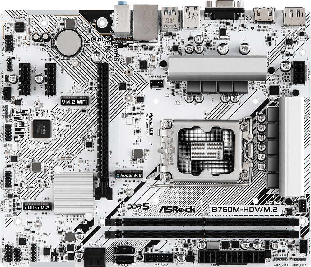 Модель: B760M-HDV/M.2. Гнездо процессора: LGA 1700. Northbridge: Intel B760. Частотная спецификация памяти: 5600. Максимальный объем оперативной памяти: 96. Слотов PCI-E x1: 2. Звук: 8 каналов (7.1). Сетевой интерфейс (Ethernet RJ-45): 2.5Gigabit. Форм-фактор: mATX. Разъемов M.2: 2. Бренд: ASROCK. PartNumber/Артикул Производителя: B760M-HDV/M.2. Тип поставки: Ret. Кол-во внешних USB 2.0: 2. Разъемов SATA3: 4. Кол-во внешних USB 3.0: 3. Поддерживаемые процессоры: совместимость уточняйте на сайте производителя. Поддержка частот оперативной памяти: до 7200+(OC) МГц. Поддерживаемые модули памяти: совместимость уточняйте на сайте производителя. Режим работы оперативной памяти: двухканальный. Поддержка RAID 0: ДА. Поддержка RAID 1: ДА. Поддержка RAID 5: ДА. Поддержка RAID 10: ДА. Разъем Display Port: ДА. Разъем VGA: ДА. Разъем HDMI: ДА. Сетевой контроллер: Dragon RTL8125BG. Аудио контроллер: Realtek ALC897. Максимальное количество слотов памяти (для фильтра Ситилинк): 2. Кол-во внешних USB 3.0 (Type-C): 1. Поддержка NVMe: ДА. Поддержка RAID: ДА. Слотов PCI-E 4.0 x16: 1. Ссылка на сайт поставщика/вендора: https://www.asrock.com/MB/Intel/B760M-HDVM.2/index.ru.asp#Specification. Слотов памяти DDR5: 2. Длина упаковки (ед): 0.28. Ширина упаковки (ед): 0.24. Высота упаковки (ед): 0.06. Габариты упаковки (ед) ДхШхВ: 0.28x0.24x0.06. Вес упаковки (ед): 0.89. Объем упаковки (ед): 0.004032. BIOS: AMI. Разъем для подключения ленты RGB: ДА. Режим работы SATA RAID: 0, 1, 5, 10. Тип системы охлаждения: пассивное. Разъем питания процессора: 8 pin. Разъем питания материнской платы: 24 pin. Тип: Материнская плата. Особенности и технологии BIOS: 128Мб AMI UEFI BIOS с графической оболочкой. Всего слотов PCI-E: 3. Разъем M.2 Key E: ДА. Разъем SATA: SATA 3. Количество разъемов SATA: 4. 4-Pin PWM коннекторы для вентиляторов: 4. Разъемы для подключения передней панели корпуса: 1 x Вывод аудио на переднюю панель корпуса. M2 2280 с интерфейсом PCI-E 3.0 х4: 1. M2 2280 с интерфейсом PCI-E 4.0 х4 и SATAIII: 1. Поддержка памяти XMP: ДА. Тип поддерживаемой памяти: DIMM. Разъемов Display Port: 1. Разъемов D-Sub (VGA): 1. Разъемов HDMI: 1. Тип памяти: DDR5. EANCode: 4710483943485.