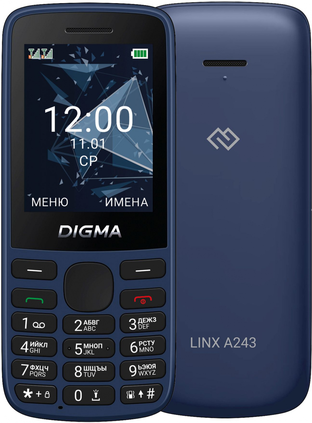 Модель: A243. Бренд: DIGMA. PartNumber/Артикул Производителя: LT2077PM. Глубина товара: 13.3. Маркетинговое название: Linx. Тип: телефон. Тип корпуса: моноблок. Технология GSM 900/1800: ДА. Технология GSM 1900: ДА. Поддержка 2 sim-карт: ДА. Диагональ экрана: 2.4. Разрешение экрана, горизонтальное: 240. Разрешение экрана, вертикальное: 320. Поддержка Bluetooth: ДА. Интерфейс USB: USB Type-C. Емкость аккумулятора: 1200. Тип карт памяти: microSD. Максимальный объем карты памяти: 32. Цвет: темно-синий. Цвет телефона: темно-синий. Дисплей: 2.4' 320x240 TFT. Процессор смартфона: SC6531DA. Аккумулятор: Li-Ion 1200мAч. Размеры: 52x124.6x13.3мм. Объем встроенной памяти (Гб): 0.032. Разрешение экрана: 320x240. Количество SIM-карт: 2. Ссылка на сайт поставщика/вендора: https://digma.ru/catalog/item/22529. Вес упаковки (ед): 0.188. Вес товара: 54.1. Модель процессора: SC6531DA. Разъем для подключения наушников: 3.5 мм. Встроенный фонарик: ДА. Возможность зарядки от USB: ДА. Разъем для зарядного устройства: USB Type-C. Тип аккумулятора: Li-Ion. Материал корпуса: пластик. Тип матрицы дисплея: TFT. Ширина товара: 52. Высота товара: 124.6. Тип SIM-карты: mini SIM. EANCode: 4630143133325.