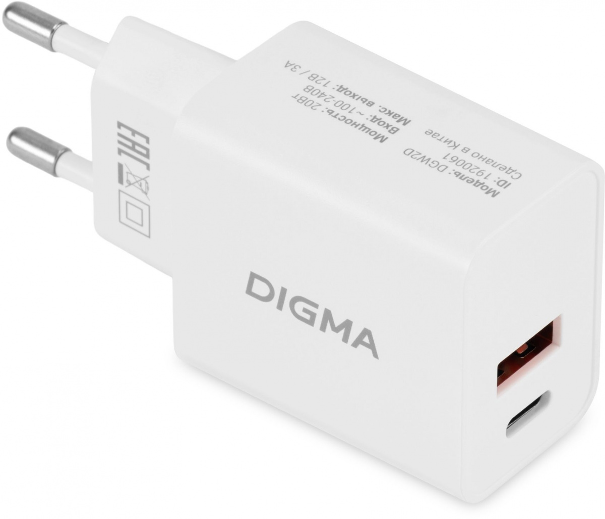 Модель: DGW2D. Цвет: белый. Тип устройства (для названия): Сетевое з/у. Назначение: универсальное. Подходит для планшета: ДА. Подходит для мобильного телефона: ДА. Подходит для плеера: ДА. Тип питания: от бытовой сети. Входное напряжение, мин: 100. Входное напряжение, макс: 240. Выходное напряжение, мин: 5. Выходное напряжение, макс: 12. Разъем зарядного устройства (блок включаемый в розетку): USB-C + USB-A. Совместимость для бренда: универсальное. Совместимость для мобильных: универсальное. Совместимость для планшетов: универсальное. Материал: пластик. Бренд: DIGMA. PartNumber/Артикул Производителя: DGW2D0F110WH. Глубина товара: 26.8. Сила выходного тока: 3. Сила выходного тока 2: 1. Размеры: 81x39x26.8мм. Стандарт USB Power Delivery: PD+QC. Длина упаковки (ед): 0.12. Ширина упаковки (ед): 0.065. Высота упаковки (ед): 0.035. Габариты упаковки (ед) ДхШхВ: 0.12x0.065x0.035. Вес упаковки (ед): 0.075. Объем упаковки (ед): 0.000273. Выходная мощность: 20. Вес товара: 53. Ширина товара: 81. Высота товара: 39. EANCode: 4630143137934.